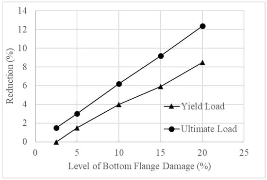 | Beam ID | Reduction in Yield Load Capacity (%) | Reduction in Ultimate Load Capacity (%) |