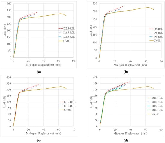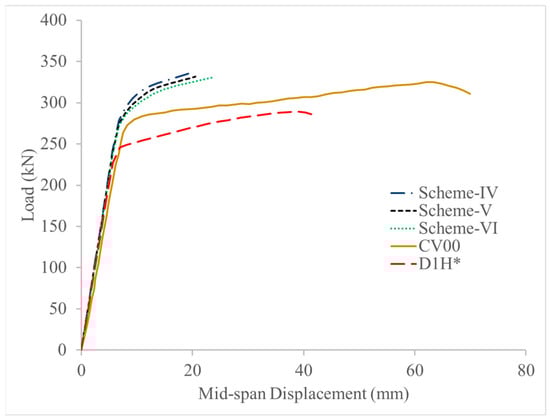 - Three of the proposed strengthening configurations, which involved the application of CFRP sheets only to the bottom, the top, or both the bottom and the top flanges (Schemes-I, II, and III, respectively), were found to be ineffective. However, the remaining three strengthening configurations of Schemes-IV, V, and VI, which involved the application of CFRP sheets to both the flanges and the web, with a minimum of six layers of CFRP sheets, could restore the strength of the steel beam with circular web openings to the level of the one without openings. An additional number of CFRP sheet layers in these schemes would result in improvements in both the load-carrying capacity and stiffness of the beams.