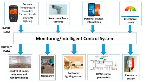 Environmental measurements inside shared buildings are common and widely conducted for different purposes. Monitoring and measuring different parameters within indoor spaces provide valuable insights into the performance, comfort, and safety of the built environment. Common measurements include temperature, humidity, CO2 levels, other air quality parameters such as volatile organic compounds (VOCs) or particulate matter (PM), light levels, energy consumption and occupancy monitoring. Figure 1 provides a scheme in which the importance of environmental sensors in buildings is shown. Among the various measurements that environmental sensors can provide, one with significant relevance is the concentration of CO2. The concentration of CO2 serves not only as a general indicator of thermal and humidity comfort, but it also, due to its correlation with human occupancy, can be utilized for other purposes where the building occupancy is essential, and other occupancy sensors (such as cameras) are inappropriate (e.g., for privacy reasons). However, it is worth noting that CO2 measurements are more intricate and complex compared to other metrics. In the following section, we delve into the diverse array of sensors employed in shared public buildings, examining their functionalities, and assessing their suitability for the unique requirements of universities and healthcare facilities.