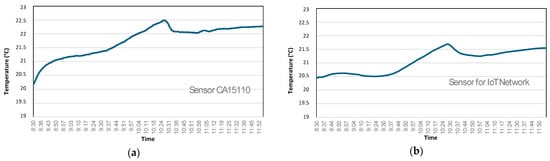 However, particular care should be dedicated to selecting the most appropriate sensors, since they usually require long calibrating procedures, and usually suffer from less accurate measurements, compared with the other commercial products. In some cases, we have also noticed that the measured values also fail to follow the trend of actual values (i.e., they measure decreasing values of CO2/temperature, when CO2/temperature is increasing). As an example, Figure 5 compares the temperature measurements of the first and the last sensor, placed in the same position. In this case, although the two sensors qualitatively appear to provide the same measurements, the first sensor registers a total increase in temperature of approximately 2 °C, while the second sensor registers an increase of approximately 1 °C. Table 2 compares the accuracy of the sensors of the three classes in terms of measurements of CO2 concentration. In this case as well, not all sensors are equally accurate, and the self-built sensorized platforms using sensors dedicated to IoT networks tend to be less accurate in detection, both for reasons related to the electronics and due to the indirect methodology adopted for measuring CO2 concentration.