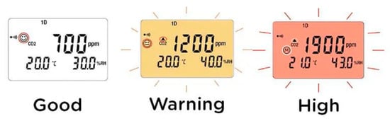 In this subsection, we examine the unique challenges encountered in monitoring and controlling environmental parameters within the university and healthcare facilities under analysis. Factors such as fluctuating occupancy levels, diverse user requirements, and regulatory compliance pose significant challenges that must be addressed to maintain indoor environmental quality, considering the different specifications and the different uses of the different structures under analysis. Among the environmental monitoring parameters, the detection of CO2 concentration stands out as particularly significant. Elevated CO2 levels inherently signify poor air quality, especially indoors, posing not only comfort issues but also the risk of pathogen transmission, as highlighted by the recent COVID-19 experience. Acceptable CO2 levels vary based on activity and environment. A healthy environment maintains CO2 concentrations below 800 ppm, while acceptable levels may be under 1200 ppm, with levels exceeding 1500 ppm (such as, for example, 1900 ppm) warranting attention and brief exposure (Figure 8). Ventilation, whether natural or mechanical, maintains health standards. Distinctions are crucial based on building usage and occupants, notably in healthcare and educational settings catering to diverse demographics.