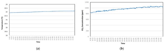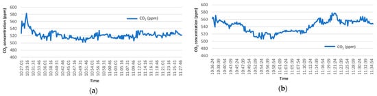 In Figure 9, monitoring data from two areas of the “hospital wards” section of the facility depicted in Figure 6b are presented. Each monitoring session lasted approximately 1 h. As shown, CO2 concentration levels consistently remained well below 800 ppm, with minimal fluctuations linked to specific situations. The monitoring of environmental parameters is inherently significant, but there are variables whose specific monitoring can provide valuable insights and serve as an indirect indicator of occupancy levels.