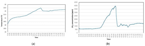 Figure 10 displays temperature and CO2 concentration data in a classroom described as Case 1 in Table 6 where a three-hour examination took place, focusing on the second and third hours. Occupancy conditions and dynamics are outlined in the Case 1 of Table 6, with no mechanical ventilation during operation. Figure 11, on the other hand, depicts data from a more dynamic event in the sameclassroom, and on the same day of the week (Saturday), but in a different occasion (final degree examination). Climatic conditions were similar on both days, with reduced differences. Occupancy and dynamics are further defined as Case 2 of Table 6.