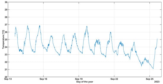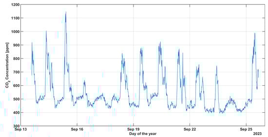 In Figure 12 and Figure 13, the results in terms of temperature and CO2 concentration in the structure shown in Figure 7a are presented from a long-term trial spanning approximately 12 days (from Wednesday, 13 September 2023, to Monday, 25 September 2023). Data were collected at 10 min intervals, resulting in 144 data points per day.