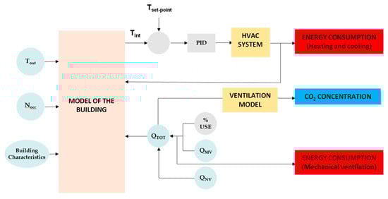 The CO2 concentration data, along with other environmental parameters, can be utilized to develop a model for the optimal control of operation. This model incorporates building characteristics, outdoor temperature, occupancy levels, and ventilation type (natural or mechanical), with airflow rate serving as input data. The model yields trends in energy consumption, CO2 levels, and indoor temperature as output. A building model (containing information about geometrical parameters and main physical characteristics) is essential for assessing energy demands, which are contingent upon the specified input parameters. Figure 14 provides a possible structure of the control system for the HVAC system implemented in a public shared building, similar to the one represented in Figure 6a. The model uses the characteristics of the building, the outdoor temperature, Tout, the number of occupants (Nocc), and the required ventilation rate, QTOT (natural, QNV and/or mechanical, QMV), obtaining as output the trends of energy consumption, the CO2 concentration, and the indoor temperature Tint, that must be close to the defined set-point value (Tset-point). The model of the building is necessary to evaluate the energy demands, which depend on the input parameters set.