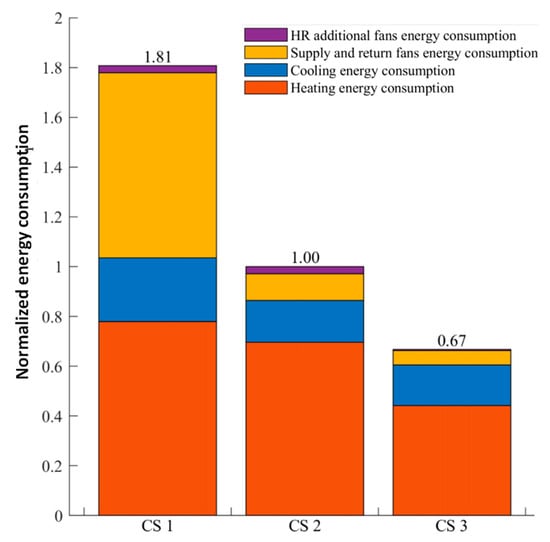 Normalized energy consumption with DCV strategies (CS3) with respect to a normal strategy (CS2) based on time operation and COVID-19 (CS1) in the structure of Figure 6a.