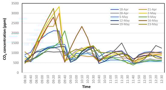 To understand this, we observed the same event over an extended period, involving a remarkably similar number of people occupying the same space at the usual times and on the usual days of a week. In ref. [24], a dataset formed by collecting measurements over ten different days, during the lectures of the same classes from 8:30 to 12:30, is described. The time step of the measurements is 10 min, resulting in a total of 40 h of records, and about 240 samples overall. The data were collected during classes of the same professors, with the objective of maintaining similar conditions (e.g., in terms of the number of students in the room, and their activity during the classes). During the first two hours, the number of students was in a range between 100 and 120, while in the following two hours it ranged from 40 to 80. The classroom is detailed in Figure 6b, and the data are presented in Table 5 (room 2). As evident from the data analysis in Figure 16, which illustrates CO2 concentration measurements across ten different events, there is significant variability in the collected data.