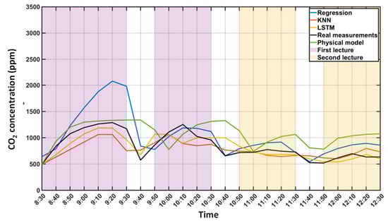 From a conceptual point of view, it would seem quite easy to build a physical model of CO2 evolution. However, as can be noticed from Equation (1), concentration depends on many variables that act in a combined manner, and none of them can usually be easily determined. Thus, the monitoring data can be very useful for developing a control system for ventilation systems.