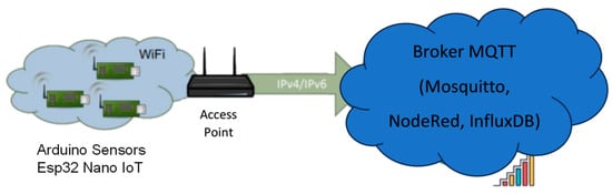 As a third example, considering low cost sensors for building monitoring [22], we have tested a self-assembled sensorized platform, constructed by connecting different digital sensors to a specific Arduino ESP32 board (Figure 4). In this case, the server collecting data from the several sensors and the communication protocols may be devised to achieve desired cyber-security levels. Also, a single server is required to gather all the data across different buildings served by the same wireless network.
