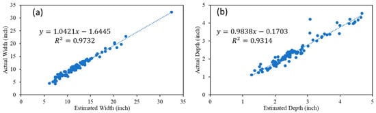 (a) Correlation between actual and predicted width, and (b) correlation between actual and predicted depth.