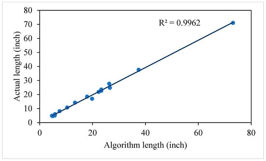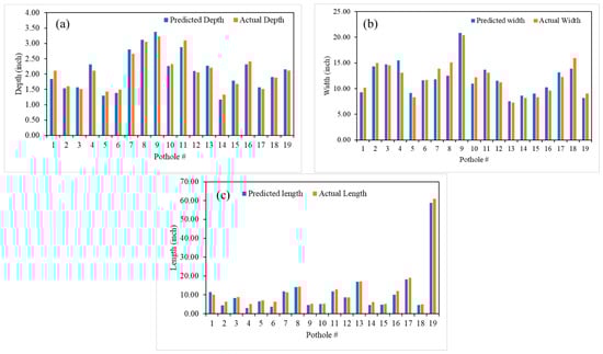 Measured vs. predicted dimension: (a) depth, (b) width, and (c) length.