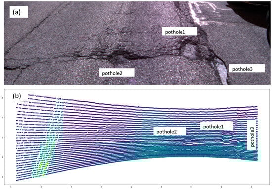 Verification of the pothole count algorithm: (a) image of captured by camera (b) LiDAR scan corresponding to the image.