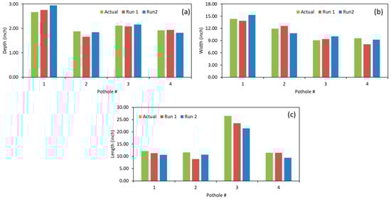 Comparison between actual and predicted dimensions for Run 1 and Run 2 at 55 mph: (a) depth, (b) width, and (c) length.