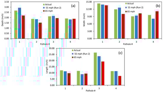 Comparison between actual and predicted dimensions for Run 2 (55 mph) and run at 65 mph: (a) depth, (b) width, and (c) length.