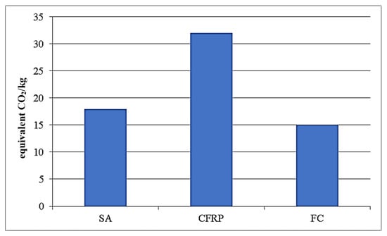 The environmental impact analysis is also important to consider. The life cycle assessment (LCA) based on embodied energy or CO2 emission calculations are significant and valuable tools for comprehensive and thorough analysis. Nonetheless, the variety in possible materials and methods used in RC structural strengthening makes it very difficult to consider a full-scale LCA study. Alternatively, a simple insight can be given by comparing the data from existing literature reviews [1,2,3,4,5,6,7,8,9]. In Figure 1, the equivalent CO2 of raw materials is given in CO2/kg of used materials considering a case of a 50% bending capacity increase of a given RC beam, considering steel plates with the mechanical anchorage strengthening technique (SA), carbon FRP sheets with epoxy resin (CFRP), and ferrocement strip type IV (FC):