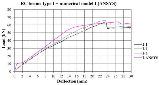 The diagrams of the experimentally measured and numerically calculated deflection of the non-strengthened beam, shown in Figure 14, have a similar qualitative flow. A higher stiffness of the numerical model in the initial phase of loading (elastic deformation zone) can be interpreted by assuming the ideal bonds between the constitutive materials. The imperfection of experimental beam models, i.e., the onset of micro-cracks at the interface of cement and aggregate, is certainly one of the reasons of the low stiffness in respect to the numerical model. A very good agreement of the results occurs in the phase after the onset of the yield of the conventional reinforcement, until failure.