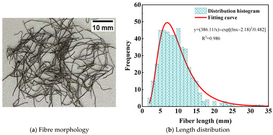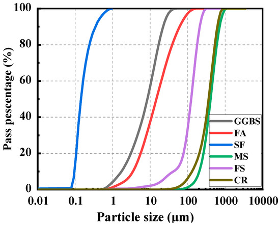 The composition materials employed in this study for T-UHPAC include a binder mixture consisting of ground granulated blast furnace slag (GGBS, S105 grade), fly ash (FA, Class F), and silica fume (SF, Grade 92). A chemical activator is formed by a sodium hydroxide solution (14 mol/L) and a sodium silicate solution (with a modulus of 2.25). The aggregate system comprises two different sizes of quartz sand (medium sand, MS, with a particle size range of 200–750 µm, and fine sand, FS, with a particle size range of 45–200 µm), as well as crumb rubber particles (CR) with D50 = 450 µm recycled from discarded tyres. The quartz sand and rubber powder share similar particle sizes, with densities of 2.65 g/cm3 and 1.13 g/cm3, respectively. Recycled steel fibres from discarded tyres (RSF) are used as additional reinforcement. BaCl2 is added as an admixture to provide retarding effects. The recycled tyre products CR and RSF are produced by Chengdu Sitong Rubber and Plastic Co., Ltd., Chengdu, Sichuan, China. Please refer to Figure 2, Figure 3 and Figure 4 and Table 1 and Table 2 for specific material parameters.