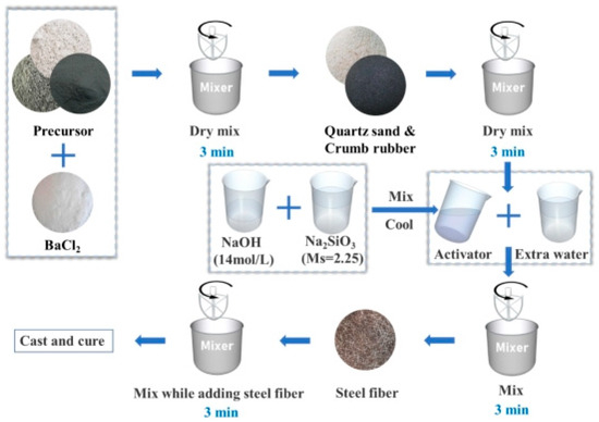 The mixing procedure for the specimens follows the flowchart shown in Figure 5 and can be divided into three main stages. First, the activator was prepared by creating a 14 mol/L sodium hydroxide solution 24 h prior to casting T-UHPAC. After the solution cooled down, it was mixed evenly with the sodium silicate solution and allowed to reach room temperature. Second, the materials were mixed. The fine aggregate was added to a planetary mixer and stirred for 3 min, followed by the addition of the coarse aggregate and another 3 min of mixing until uniformity was achieved. The alkaline activator and additional water were mixed separately and then added to the mixer, followed by an additional 3 min of mixing. The RSF was introduced in the final stage and incorporated into the slurry within 3 min. Lastly, the thoroughly mixed T-AUHPC was poured into dumbbell-shaped moulds for tensile specimens and prism-shaped moulds for flexural specimens. After the initial setting of the specimens, they were covered with plastic film for curing. After 24 h, the specimens were de-moulded and submerged in a water tank for continuous curing until the age of 28 d.