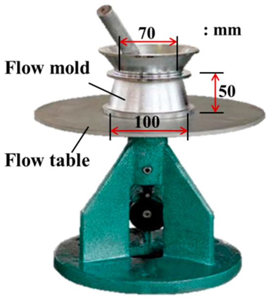 Figure 6 shows the flowability test setup. The flowability test of fresh concrete was conducted according to the code (ASTM-C1437, 2013 [40]). The testing apparatus is shown in the diagram below [2].