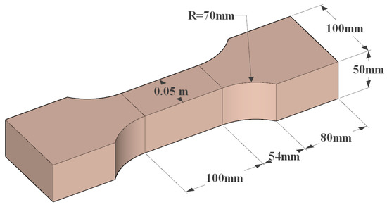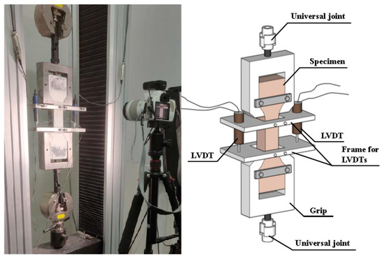 Tensile testing was conducted according to the standard T/CBMF 37-2018 [41] (as shown in Figure 7 and Figure 8). Three dumbbell-shaped specimens were prepared for each group to perform axial tensile loading on T-UHPAC, and strain data were recorded using a TDS-540 data logger manufactured by Tokyo Measuring Instruments Laboratory, Tokyo, Japan. The specimens were loaded using displacement control, with a loading rate of 0.06 mm/min. The gauge length of the specimens for measuring strain was set at 100 mm. Prior to the test, strain gauges were attached to the middle region of the gauge length, and two linear variable displacement transducers (LVDTs) were symmetrically placed along the axial direction.