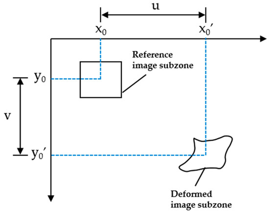 The images captured by the digital image correlation (DIC) system are actually stored in the computer in matrix form. For convenience, we use f(x, y) to represent the pre-deformation image and g(x′, y′) to represent the post-deformation image. The basic principle of the DIC method is shown in Figure 9. First, a reference image subzone is selected in the pre-deformation image, with the measurement point (x0, y0) as the centre and a certain size. Then, through a certain correlation search method, the target image subzone with the maximum correlation to the reference image subzone, centred at (x0′, y0′), is found in the post-deformation image. The displacement of the measurement point (x0, y0) is calculated as follows: u = x0′ − x0, v = y0′ − y0. The calculated displacement is in pixels. By combining it with calibration results, the actual displacement of the measurement point in the world coordinate system can be obtained.