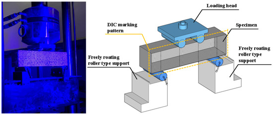 Flexural testing was conducted following ASTM C1609/C1609M [42], (as shown in Figure 10 and Figure 11). A four-point bending test was performed on the MTS-370 loading system at a displacement rate of 0.075 mm/min. Prior to the test, the side surfaces of the specimens were coated with white paint and marked with black dots to facilitate the measurement of deflection using DIC-3D technology. DIC technology involves capturing high-definition images of the specimen’s surface markings using cameras and analyzing the motion of these markings using correlation functions to obtain deformation information [43]. The accuracy of DIC technology has been validated and it can effectively capture key information such as strain and displacement of the specimen [44,45]. Please refer to Figure 8 for the specific testing setup.