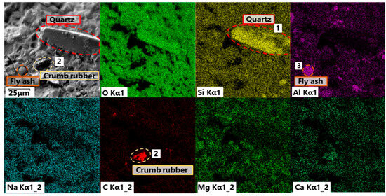 Upon observation, it is evident that the Si element is significantly enriched in Region 1, and based on the comparison with the surface morphology, it can be inferred that Region 1 corresponds to quartz sand particles. On the other hand, the carbon © element is only present in Region 2, which can also be inferred from the surface morphology as corresponding to rubber particles. The aluminium (Al) element is distributed in a point-like manner, including in Region 3, and it can be deduced that Region 3 corresponds to partially hydrated fly ash particles.