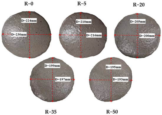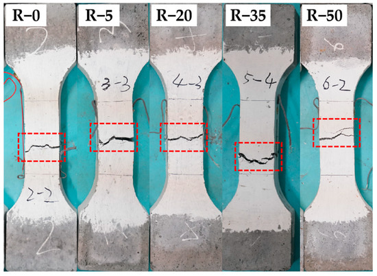 Figure 14 shows the damage pattern of the specimens with different CR content in T-UHPAC. The red dashed lines highlight the cracks. During the test, it could be observed that micro-cracks appeared in the middle of the specimen as the tensile loading increased. As the test load further increased, the micro-cracks expanded, accompanied by a slight and noticeable cracking sound. This is consistent with the common tensile failure mode of steel fibre-reinforced UHPC materials [47,48]. This provides valuable data for subsequent stress–strain analysis of T-UHPAC under uniaxial tensile loading. From the detailed cross-sections, we can see that after the crack initiation, the steel fibres undergo pull-out from the matrix, providing bridging action in the form of fibre pull-out. Moreover, Figure 15 illustrates the flowability of freshly mixed T-UHPAC, as it showed an increase in the replacement ratio of CR, significantly reducing the workability of the fresh paste.