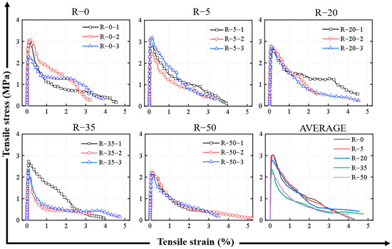 The effect of replacement ratios of crumb rubber on stress–strain curves under tension.