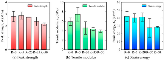 The effect of replacement ratios of crumb rubber on tensile mechanical property index of T-UHPAC. (a) Peak strength; (b) Tensile modulus; and (c) Strain energy.