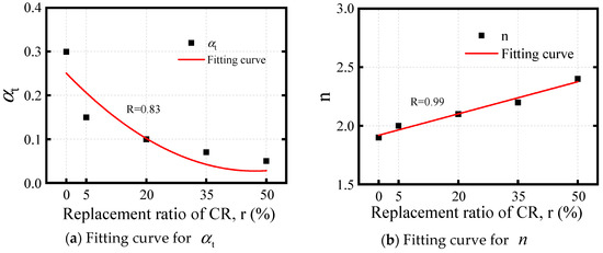 The plays a role in the evolution of damage in concrete under uniaxial tension, while and are the parameter values related to the descending segment of the stress–strain curve under uniaxial tension. The replacement ratio of CR affects the damage evolution of T-UHPAC. A calculation based on Equations (6) and (7) was performed with the fitting effect of the CR replacement ratio and is shown in Figure 18.