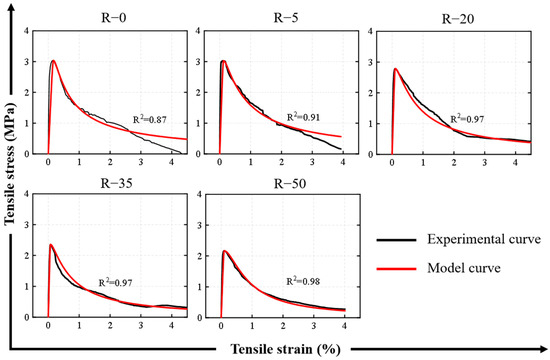 Drawing from the outcomes of uniaxial tensile stress–strain experiments conducted on T-UHPAC, this study referred to the concrete tensile constitutive model proposed in GB50010-2010 [54]. Modifications were made to the model, taking into consideration the effects of CR on the material damage coefficients (Equations (2)–(5)). The effectiveness of fitting the stress–strain relationship of T-UHPAC was assessed.
