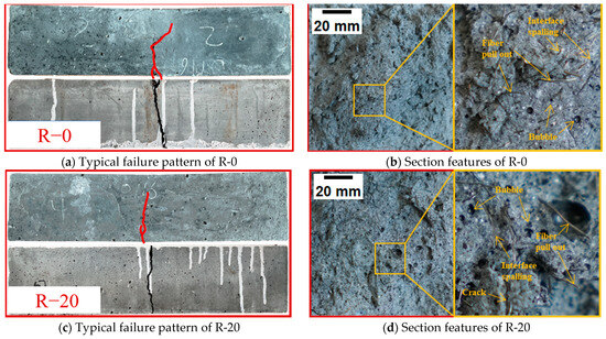 Failure mode of flexural test. (a) Typical failure pattern of R-0; (b) Section features of R-0; (c) Typical failure pattern of R-20; and (d) Section features of R-20.