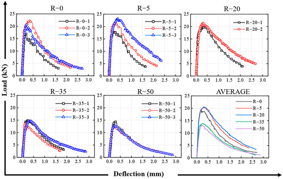 This study employed Digital Image Correlation (DIC) technology to capture deflection changes during the bending tests of the T-UHPAC specimens. The real-time load was collected using the MTS-370 system. The flexural load–deflection curves of T-UHPAC were obtained and presented in Figure 21. Under observation, T-UHPAC exhibited rapid and nearly linear growth in deflection until reaching the peak load. Subsequently, the deflection started to decrease progressively until failure. During the ascending phase of the load, the CR replacement ratio showed minimal influence on the slope of the load–deflection curve, indicating a relatively constant rigidity of the material. However, the peak load was strongly affected by changes in the CR replacement ratio. A higher CR replacement ratio resulted in an early cessation of the load growth phase. In the descending phase of the curve, a higher CR replacement ratio led to a smaller slope, directing to a more gradual deflection decrease.