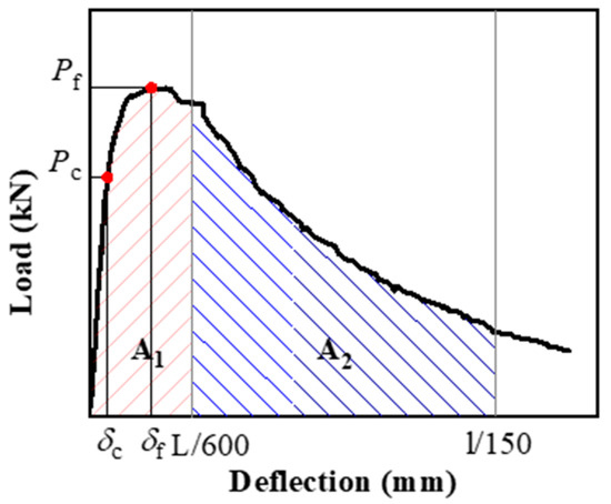 As shown in Figure 22, the basic flexural performance of T-UHPAC is primarily described through the initial cracking load (), peak load (), corresponding initial cracking deflection (), peak deflection (), and flexural strength indices (,) as stated in existing research [55] (Figure 17). The flexural strength indices are calculated according to Equation (8).