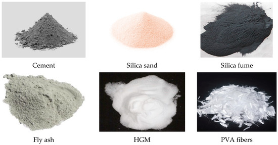 Figure 1 shows cement, silica fume, silica sand, fly ash and HGMs visualization. General purpose (GP) cement was used as a cementitious binder, which complies with the requirements for type GA cement under AS3972 [23]. The chemical composition and physical properties of the cement can be viewed in Table 1 and Table 2. Grade 1 fly ash (FA) was chosen as a supplementary cementitious material for use with GP cement which conforms to Australian Standard AS3582.1 [24]. It serves to improve the mechanical performance of the concrete. The chemical composition and physical properties of the FA can be viewed in Table 1 and Table 2. The silica fume (SF) used satisfies ASTM C1240 [25] and AS3583.3 [26] and serves as an additive in cementitious composites to enhance the mechanical properties and improve the durability of concretes. The chemical composition and physical properties of the cement can be viewed in Table 1 and Table 2. AFS 40-50 Silica sand (SS) contributed as a fine natural aggregate that complies with AS1141 [27]. Its chemical composition is provided in Table 1 and Table 2. PVA was the chosen fiber reinforcement in this ECC, and its detailed physical properties are furnished in Table 3. The HGM used has a density range of 0.2–0.6 g/cm3. The high sphericity and fineness imply a particle size ranging from 2 to 150 μm. The density, crushing strength and particle size of all HGM fillers used in LW-ECC are summarized in Table 4 where series-H is hydrophilic and lipophilic, and series-T and GS are hydrophilic. In Table 4, the particle size distribution corresponding to the percentages 10%, 50%, and 90% of particles under the reported particle size are represented by D10, D50, and D90, respectively.