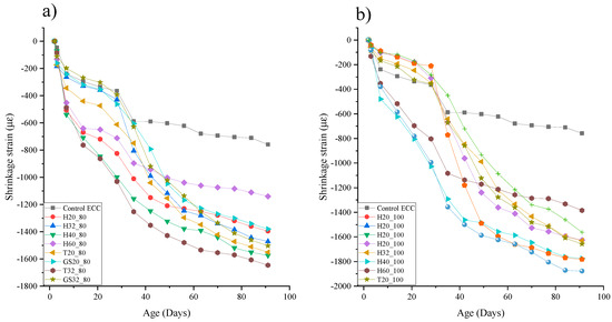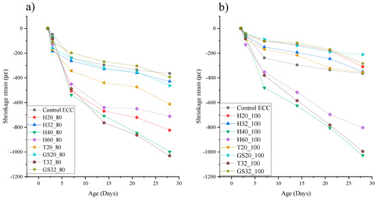 Shrinkage strains measured at 2, 3, 7, 14, 21, and 28 days, (a) 80% HGM; (b) 100% HGM.