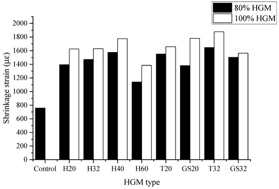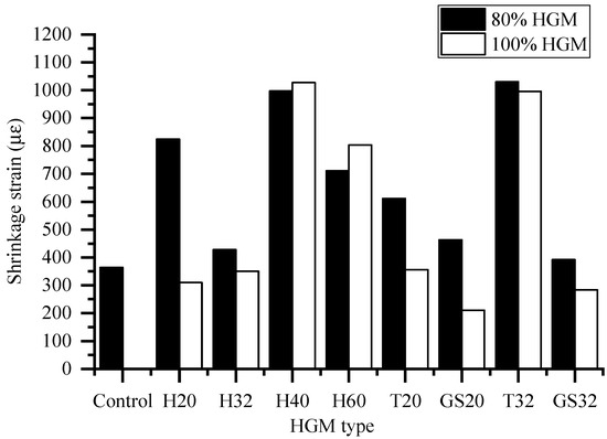 Shrinkage strain of respective type of HGM measured at 28 days.