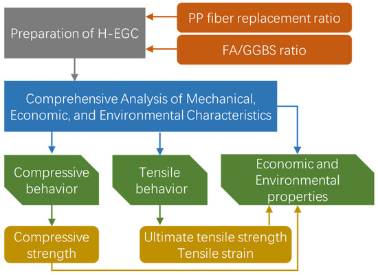 In order to comprehensively evaluate the mechanical behavior and economic and environmental benefits of hybrid PE/PP fiber-reinforced EGCs (H-EGCs) under different FA/GGBS ratios and PP fiber replacement ratios, this paper investigates three FA/GGBS ratios (7:3, 6:4, and 5:5) and five PP fiber replacement ratios (0% to 100%, with 25% increments) to analyze the axial compressive and axial tensile properties of H-EGC. It also assesses the economic and environmental performance to offer insights for designing cost-effective EGCs. Figure 1 depicts the research process of this paper in the form of a flowchart.