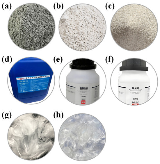 Raw materials for H-EGCs. (a) FA; (b) GGBS; (c) QS; (d) waterglass; (e) NaOH; (f) BaCl2; (g) PE fibers; (h) PP fibers.