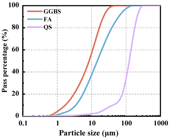 The raw materials used for preparing H-EGCs in this study primarily include FA (Class F, grade I [40]), GGBS (S105 grade [41]), quartz sand (QS), sodium hydroxide, waterglass, PE fibers, PP fibers, a retarder (BaCl2), and water, as depicted in Figure 2. The waterglass modulus is 2.25, composed of 29.99 wt% SiO2, 13.75 wt% Na2O, and 56.26 wt% H2O. The varying elemental content within FA and GGBS is represented by their respective proportions of oxide masses, as shown in Table 1. The particle size distribution of FA, GGBS, and QS was determined using a laser particle size analyzer (Mastersizer 3000), and the results are shown in Figure 3. Table 2 provides the physical and mechanical parameters of PE and PP fibers.
