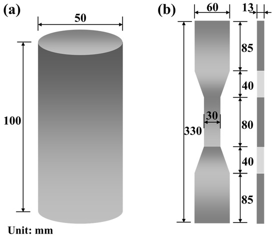 Specimen dimensions. (a) Uniaxial compressive specimen; (b) uniaxial tensile specimen.