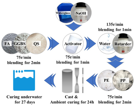 In this study, cylinder and dumbbell-shaped specimens were prepared for axial compressive and axial tensile tests, with the dimensions illustrated in Figure 4. Prior to specimen preparation, the alkali activator needed to be prepared. The alkali activator was obtained by mixing waterglass with a sodium hydroxide solution (10 mol/L) in a mass ratio of 2:1 and then cooling the mixture. The mixing process for the H-EGCs is depicted in Figure 5. Initially, dry materials were added to a planetary mixer and dry blended at a slow speed (75 r/min) for 2 min. Following this, the alkali activator was gradually added to the mixture without halting the machine, and stirring continued at a low speed for 1 min. Afterwards, water and retarder were introduced into the mixture and blended at a rapid speed of (135 r/min) for 1 min. Finally, fibers were added while stirring at a slow speed for 3 min. The entire mixing process took approximately 7–8 min. Upon completion of blending, the mixture was poured into molds for shaping and left to undergo ambient curing for 24 h. Subsequently, the specimens were demolded, immersed in water for 27 days, and mechanical performance tests were conducted at the age of 28 days.