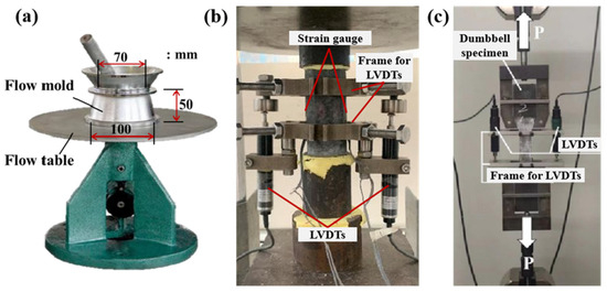 Test setup. (a) Flowability test; (b) uniaxial compressive test; (c) uniaxial tensile test.