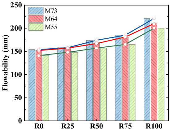 Figure 7 illustrates the flowability of fresh H-EGCs with different FA/GGBS ratios and varying PP fiber replacement ratios. It can be observed that the slump flow of fresh H-EGCs with different FA/GGBS ratios increases with the rise in PP fiber replacement ratios. Among them, the flowability of H-EGCs with a fly ash slag ratio of 7:3 exhibits the most significant enhancement with increasing PP fiber replacement ratios, with a 43.5% increase in slump flow for M73-R100 compared to M73-R0. Factors influencing the flowability of fresh geopolymer mortar with fibers mainly include fiber surface area, surface hydrophilicity, flexibility, etc. [45]. In this scenario, the observed effect is primarily ascribed to the smaller aspect ratio and higher stiffness of PP fibers in comparison to PE fibers. As the PP fiber replacement ratios increase, the occurrence of PE fiber aggregation during matrix mixing can be mitigated., thereby improving the flowability of EGCs and the dispersion of fibers.