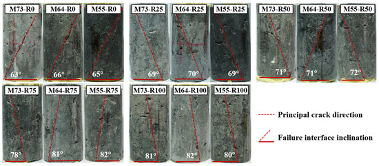The failure modes of uniaxial compressive specimens of H-EGCs are shown in Figure 7. As shown in Figure 8, inclined primary cracks penetrate the side of the cylinder specimens from top to bottom, indicating a vertical splitting failure with pronounced compressive brittleness behavior [12]. Numerous crack branches originate around the main crack, and there is no apparent spalling on the surface at the time of failure, indicating good integrity and highlighting the effective bridging role of fibers after specimen failure. Furthermore, Figure 8 suggests that the FA/GGBS ratio does not exhibit a significant impact on the compressive failure mode of cylinder specimens, but the PP fiber replacement ratio notably influences the fracture interface inclination. As the PP fiber replacement ratio increases, the angle of fracture interface inclination rises from approximately 60° to around 80°, indicating a more pronounced compressive brittleness. This observation could be attributed to the comparatively smaller aspect ratio and lower elastic modulus of PP fibers when contrasted with PE fibers, leading to a reduction in the bridging effect of fibers and consequently affecting compressive ductility.