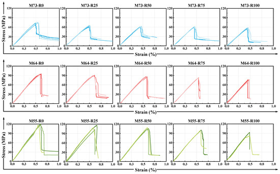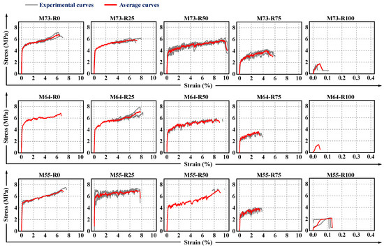 Figure 9 depicts the compressive stress–strain curves of H-EGCs. The curves exhibit three distinct stages: elastic, stress drop, and plateau. In the elastic stage, the specimen remains uncracked, and the stress–strain relationship is relatively linear. During the stress drop stage, cracking occurs due to the hydrophobic nature of the synthetic fibers, leading to a lack of strong bonding between the fiber and matrix and resulting in a sudden stress redistribution. After the stress drop, an equilibrium is reached between internal stresses and the fiber bridging effect, leading to a plateau in the stress–strain curve. It is evident from the stress–strain curve that H-EGCs lack good post-peak ductility, displaying significant compressive brittleness.