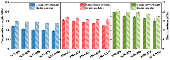 Additionally, contrasting the compressive mechanical properties of H-EGCs under different FA/GGBS ratios revealed an enhancement in compressive strength and elastic modulus with an increase in GGBS content. This is consistent with the findings of Rafeet et al. [36]. As the GGBS content increased from 30% to 50%, the compressive strength and elastic modulus of M55-R0 achieved values of 118.3 MPa and 20.52 GPa, respectively, representing an improvement of 59.6% and 38.1% compared to M73-R0. The reason for the increase in strength and modulus could be attributed to the higher reactivity of GGBS, which favors the formation of more gel and a denser microstructure [46]. Furthermore, the increase in GGBS content leads to an increase in the Si/Al ratio in the mixture, which in turn has a positive effect on the compressive performance [47].