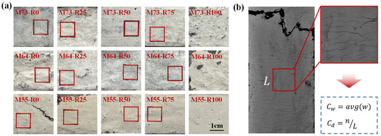 (a) The crack morphology of H-EGCs; (b) method for statistical analysis of tensile crack characteristics. w represents the crack width; n represents the number of cracks; L represents the length of the measuring zone.