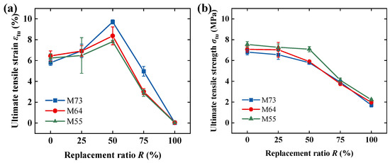 Figure 15 illustrates the relationship between the tensile strength and ultimate tensile strain of H-EGCs with varying PP fiber replacement ratio. As shown in the figure, with the PP fiber replacement ratio increasing from 0% to 100%, the ultimate tensile strength of the M73 group drops from 6.81 MPa to 1.71 MPa, representing a reduction of 75%; in the M64 group, the tensile strength of the specimen drops from 7.21 MPa to 2.00 MPa, showing a decrease of 72%; the M55 group also follows a similar trend, experiencing reductions of 69% in both average tensile initial cracking strength and ultimate tensile strength. Notably, the tensile strength of the M55 group with a higher content of GGBS is generally higher than the other groups. From Figure 15a, it can also be observed that the tensile strain capacity of H-EGCs with different FA/GGBS ratios shows a trend of initially increasing and then decreasing with the increase in PP fiber replacement ratio, reaching a peak when half of the fibers are replaced with PP fibers. When the PP fiber replacement ratio exceeds 50%, the insufficient fiber bridging effect fails to meet the micro-mechanical design criteria for high-ductility concrete [50]. Overall, H-EGCs with lower GGBS ratios exhibit higher ultimate tensile strain, consistent with their higher crack density.